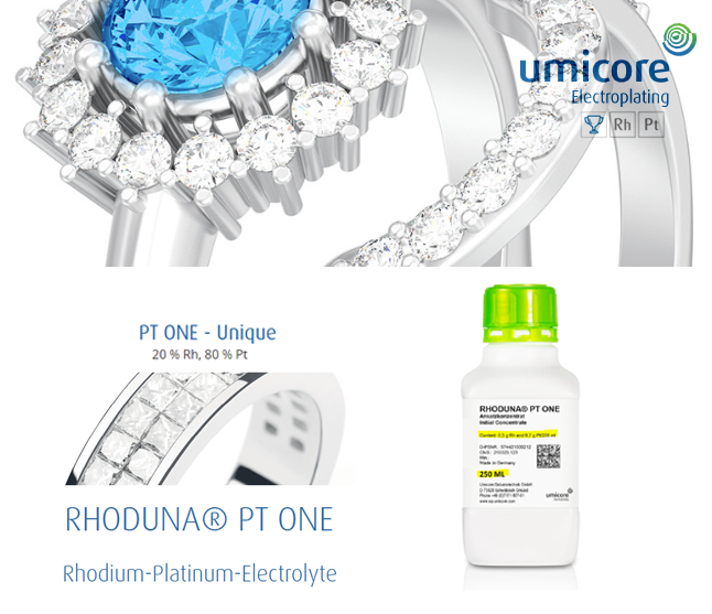 RHODUNA® PT ONE is unique in our product portfolio in many ways. Like its big brother RHODUNA® PT, the ONE variant is an economical alternative for pure rhodium. However, with the difference that RHODUNA® PT ONE is designed for small scale and the metal content is reduced to one gram per liter. This allows extremely economical rhodium plating starting with the first liter of electrolyte - and with almost constant layer properties. Additional benefits include easy handling thanks to a simple work area and the reduction of the necessary components to an absolute minimum - apart from the initial concentrate, only water is required for electrolyte makeup.